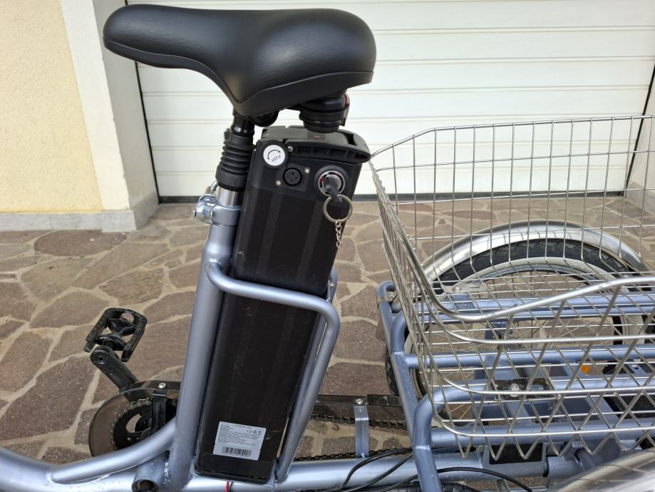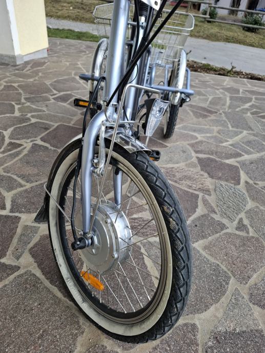 Prodam skoraj nov (600km) elektricni tricikel spanskega proizvajalca primeren za invalide (mozganske poskodbe) ali starejse osebe. Menjalnik rocni notranji Shimano Nexus 6 prestav, elektricni dodatni 5 prestav. Prodajam izkljucno zaradi premalo uporabe. Prednji del se lahko sprosti tako, da se da nekoliko nagibati in zadnji kolesi sledita grbinam ali vdolbinam na cesti in tako tricikel ni tog. Cena novega je bila 2.300€ (racun).