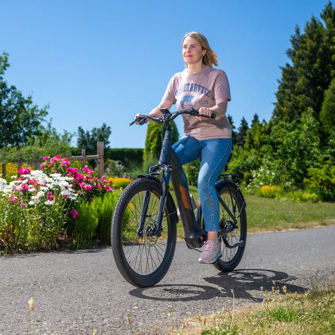 Odsotnost zgornje cevi okvirja ga naredi idealnega za vsakogar – ne glede na to, ali ste manjši ali želite le udobno sedeti. Na voljo je v velikostih okvirja 17″ in 19″, s kolesi premera 27,5″. Pnevmatike so v bistvu enake tistim na gorskem kolesu, zato vam ni treba skrbeti za neraven teren. V bistvu imate dve kolesi v enem: potovalno in gorsko kolo. Našli boste tudi nosilec, luči in blatnike.