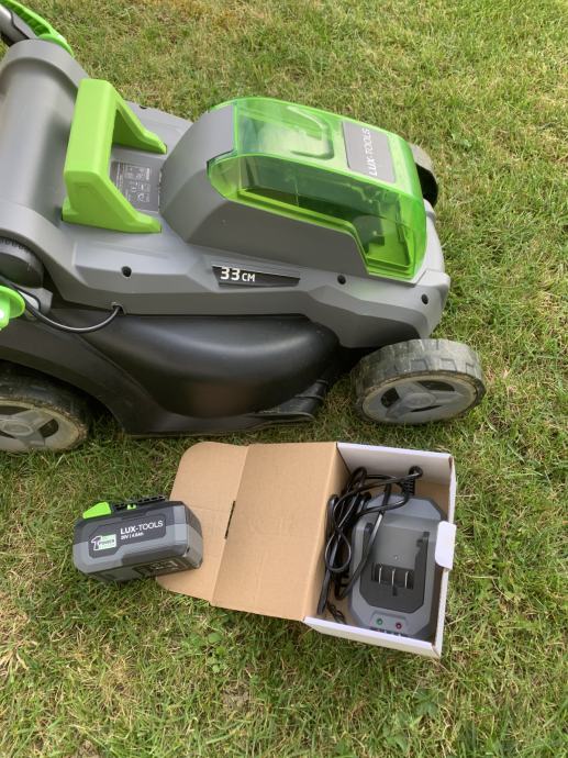 Akumulatorska kosilnica z baterijo in polnilcem.