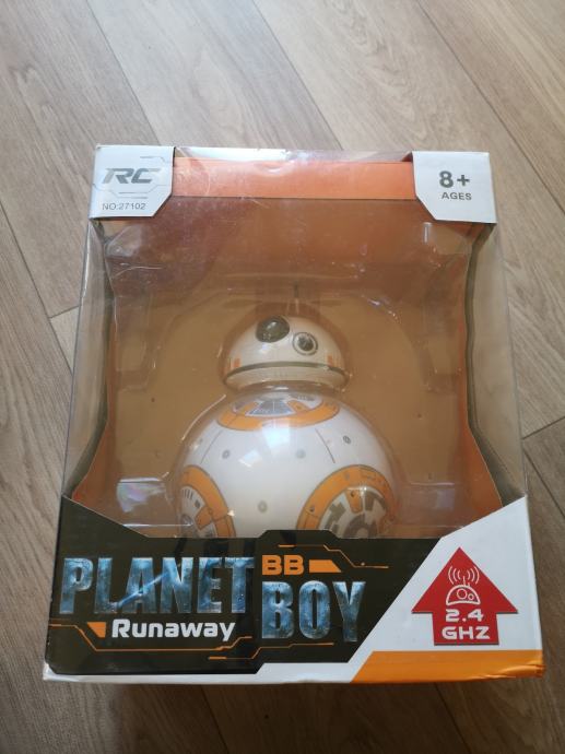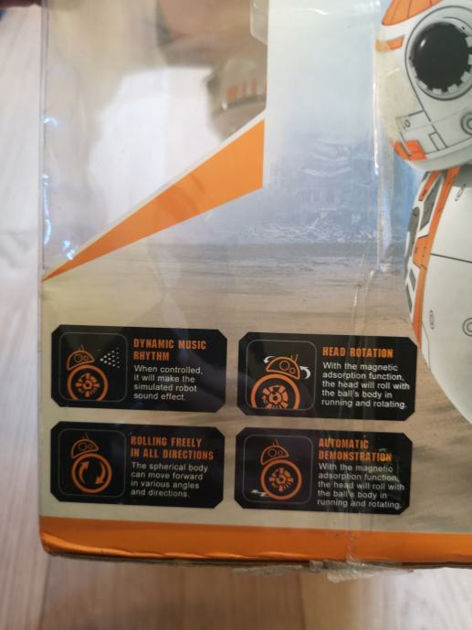Rabljen vendar delujoč robot na daljinski upravljalnik v podobi BB8 iz Star Wars sage.