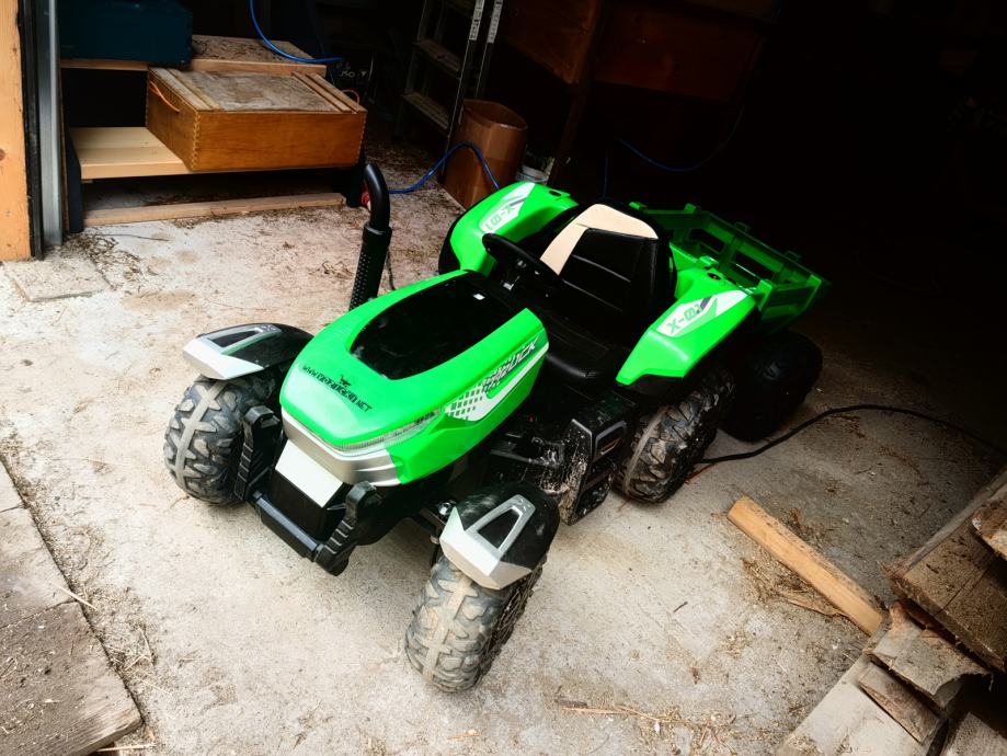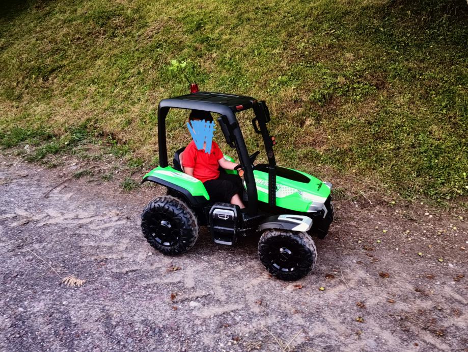 Traktor ima dve prestavi in je zelo močan. ima tudi prikolico in naljinski opravljalec za starše.