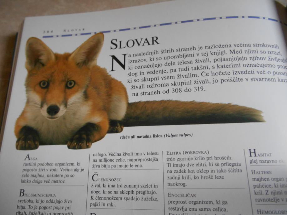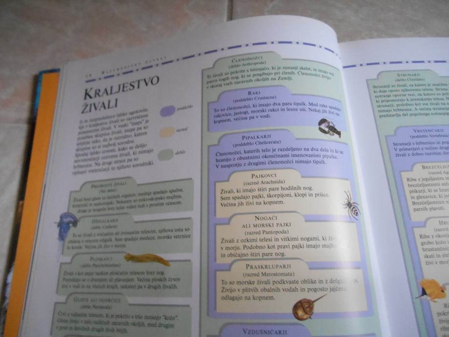 "Ta izčrpni, razumljivi in privlačni priročnik je potovanje po celem živalskem kraljestvu, od najmanjše praživali do največjih sesalcev, ki naseljujejo Zemljo. Predstavlja več kot 2000 živali, vključuje čudovite fotografije. Enciklopedija je zelo pregledna, razdeljena na nevretenčarje in vretenčarje ter znotraj teh na posamezne skupine. Vsako geslo podrobno opiše značilnosti živali, njeno razširjenost, latinsko poimenovanje. Preobrazba živali, zimsko spanje, simbioza so razloženi v posebnih enotah, na koncu je obsežen slovar in kazalo."