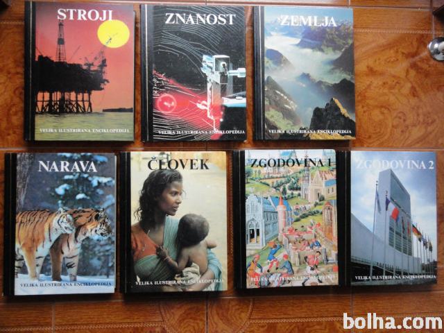 Knjige VELIKA ILUSTRIRANA ENCIKLOPEDIJA, 7 KNJIG (ZEMLJA,NARAVA,STROJI,ZNANOST,ČLOVEK,ZGODOVINA 1,ZGODOVINA 2) MLADINSKA KNJIGA 1984, večji format, trde platnice, 22x29cm, 2160 strani, 10500 ilustracij (7200 barvnih), 200 zemljevidov, dobro ohranjene, v kompletu 7 knjig za 25 eur.