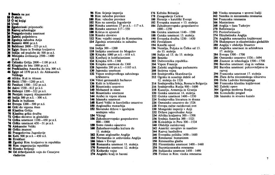 • razvoj arheologije • stare civilizacije • Rim in Grčija • srednji vek • novi vek • industrijska in meščanske revolucije • kolonializem • 19. in 20. stoletje • socializem • neuvrščeni • časovni preglednici, 370 strani, okrog 1400 slik in kart.