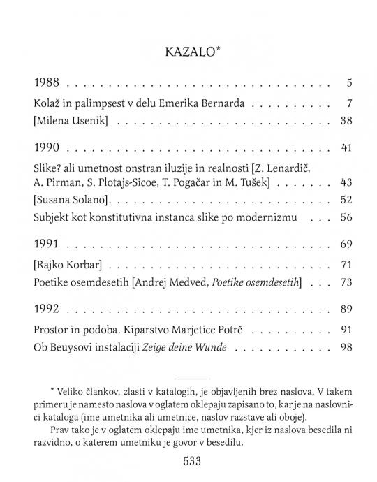 Po bolj splošnoteoretskih sklopih, ki so našli prostor v prvem delu (Slovenska umetnost; Vzhod–Zahod; Bela kocka, vloga kustosa, vloga institucije; Vizualno/nevizualno; Proizvodnja nacionalne tradicije itn.), drugi zvezek združuje konkretnejše analize del likovnih umetnikov in razstav (individualnih in skupinskih), pri katerih je Igor Zabel sodeloval ne samo kot teoretik, ampak tudi kot kustos (Beneški bienale, Manifesta 3, U3). Delu je priložena tudi obsežna bibliografija.