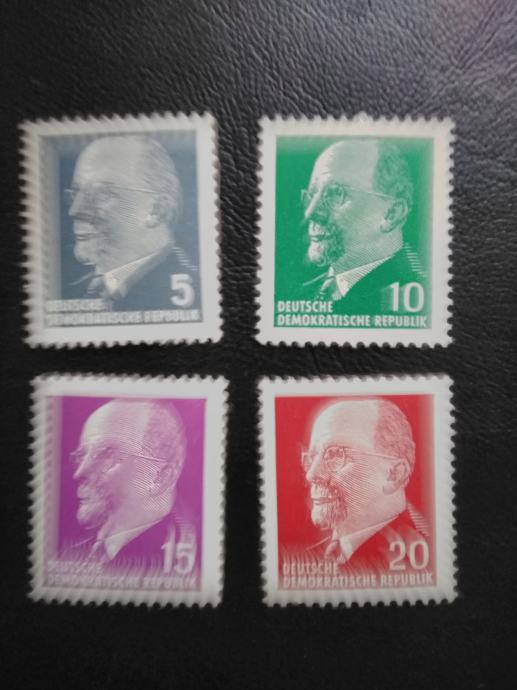 Prodajam dvojnike in ostale viške iz svoje zbirke. DDR 4 celotna serija rednih znamk Ulbricht, Michel 845/8, lepo ohranjeno.