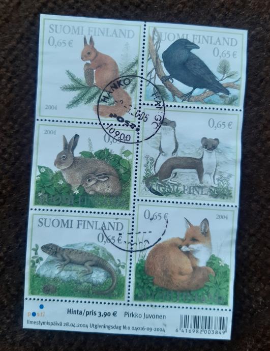 Prodajam dvojnike in ostale viške iz svoje zbirke. Finska, celoten žigosan blok, gozdne živali, ptice, zajci.