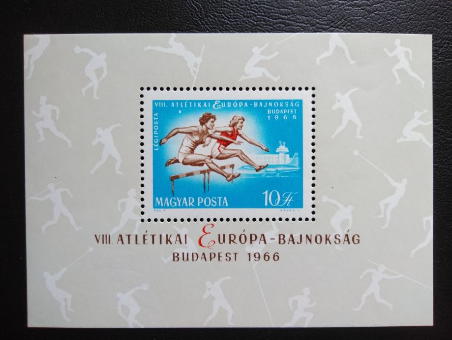 Prodajam dvojnike in ostale viške iz svoje zbirke. Madžarska,1966, blok 54 a šport, atletika, številka po katalogu Michel: 54a, kataloška vrednost (Michel): 10 €.