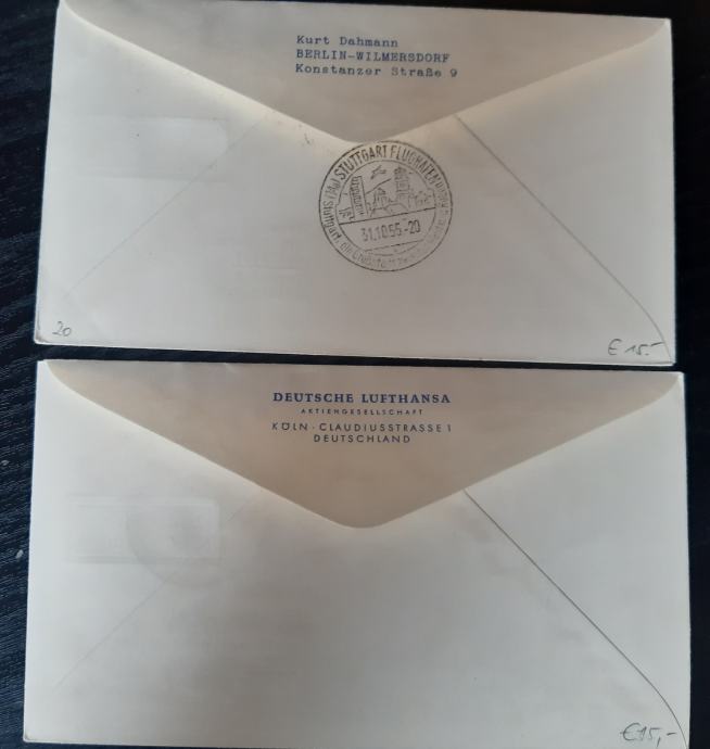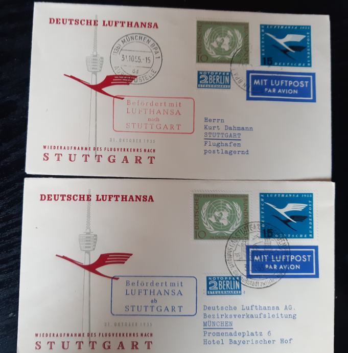 Prodajam dvojnike in ostale viške iz svoje zbirke. Nemčija 1955, 2 pismi z boljšo frankaturo, letala, avioni.