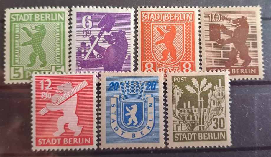 Prodajam dvojnike in ostale viške iz svoje zbirke. Stadt Berlin celotna serija, Michel 1/7a, kat. vrednost 3,5 €.