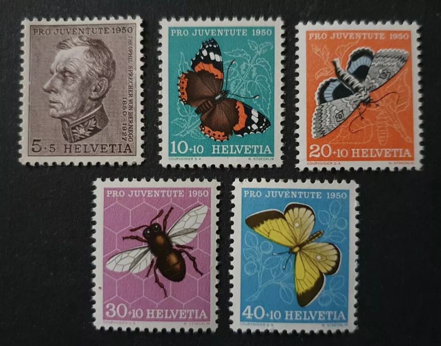 ŠVICA 1950 PRO JUVENTUTE ŽIVALI ŽUŽELKE ** Mi 550/554 serija (HV-173)