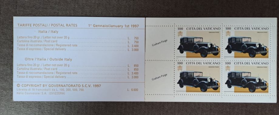 Prodajam dvojnike in ostale viške iz svoje zbirke. Vatikan, zveščič 1997, starinski avtomobili, Michel MH 1198/01. Prodam po nakupni vrednosti na pošti.