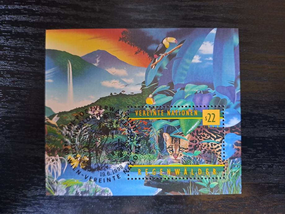 Združeni Narodi Dunaj 1998, blok 9 žigosan favna, živali, mačke, ptice