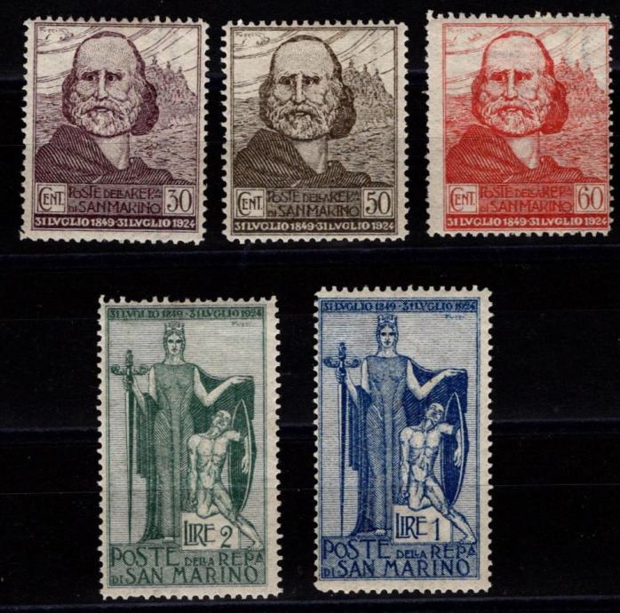 Prodam 5 znamk iz serije, San Marino 1924 MiNr: 100, 101, 102, 103,104. Znamke so čiste - nežigosane, odlično ohranjene.