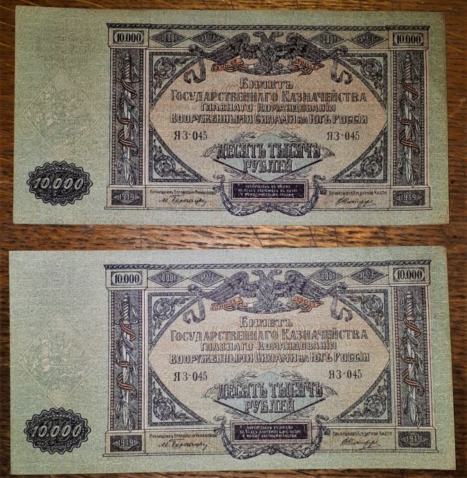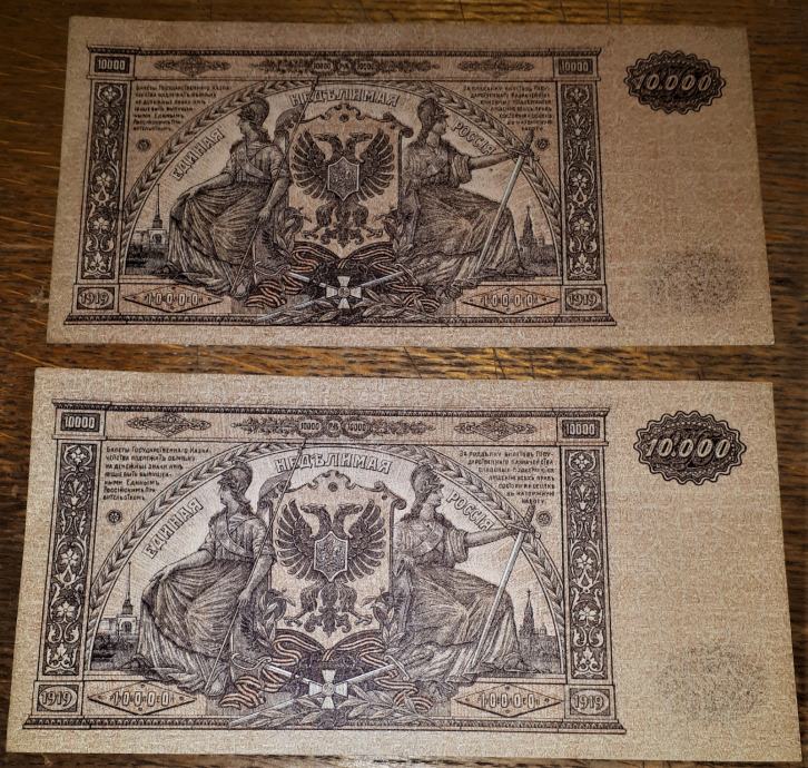 Prodam dva lepo ohranjena večja bankovca za 10000 rubljev z letnico 1919, kot sta vidna na fotografijah; cena je za en bankovec.
