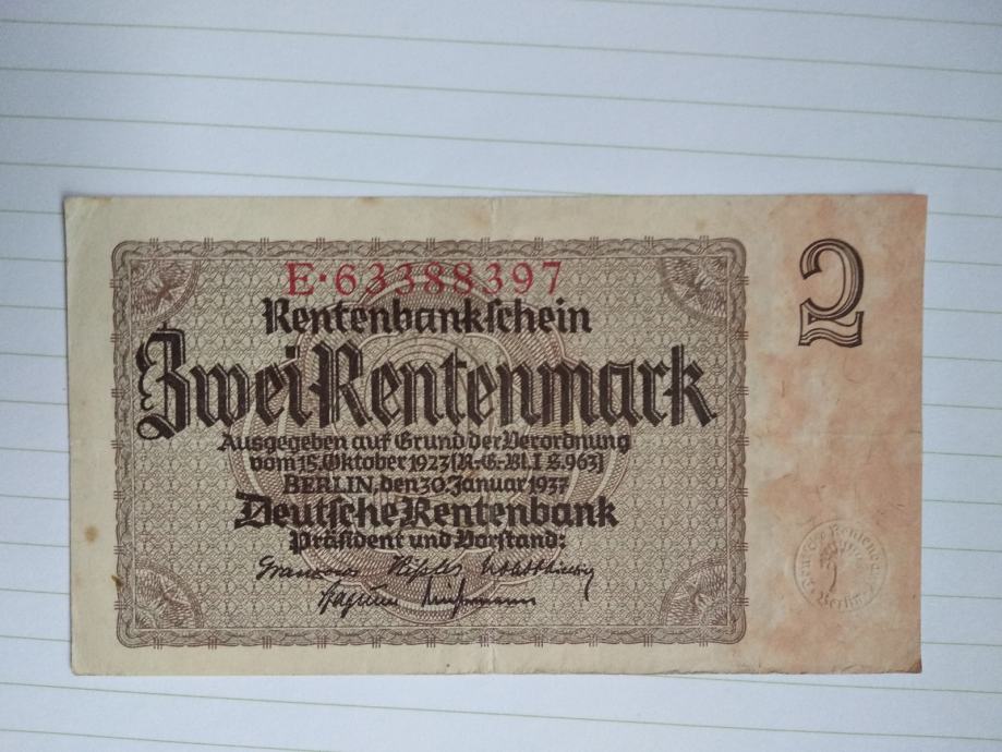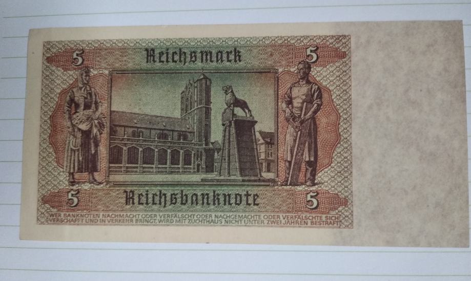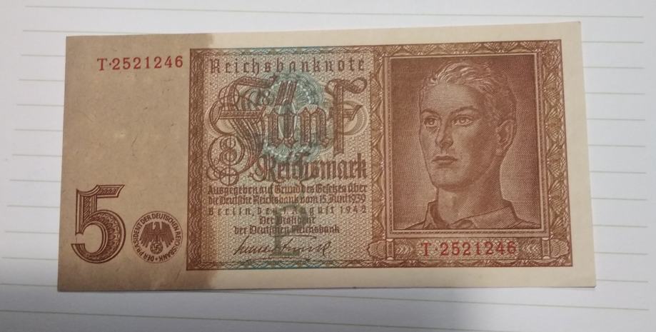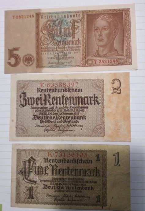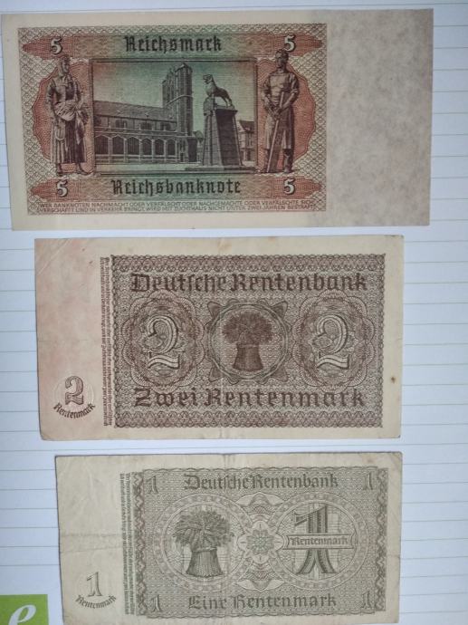 Prodam bankovec 5 rajhmark 1942 ( 7 stevilk v serijski številki) , 2 rentenmark 1937, 1 rentenmark 1937. 5 mark XF - UNC, 2 mark XF, 1 mark F. Cena za 3 bankovca.