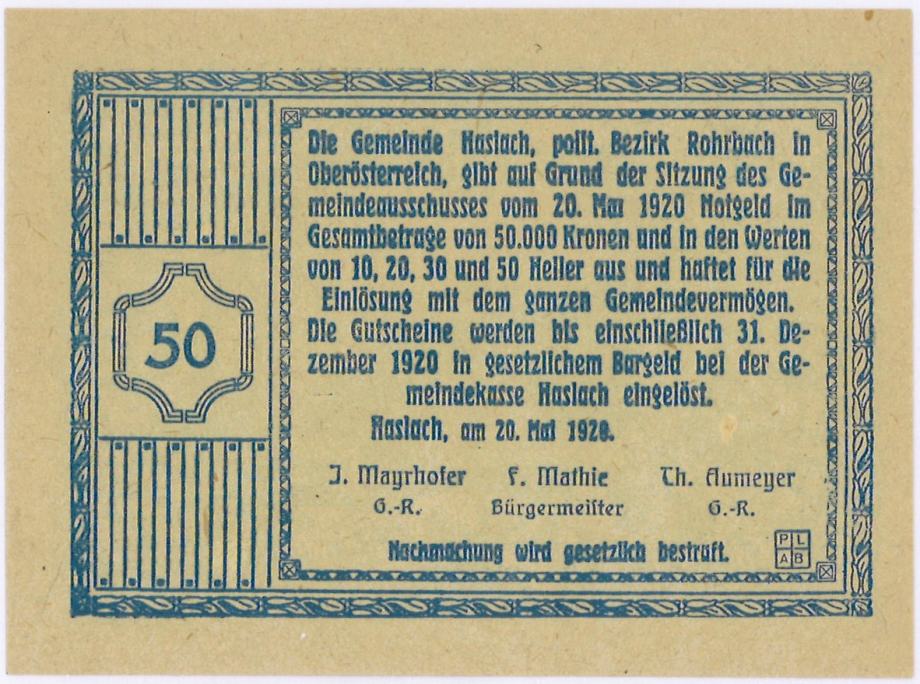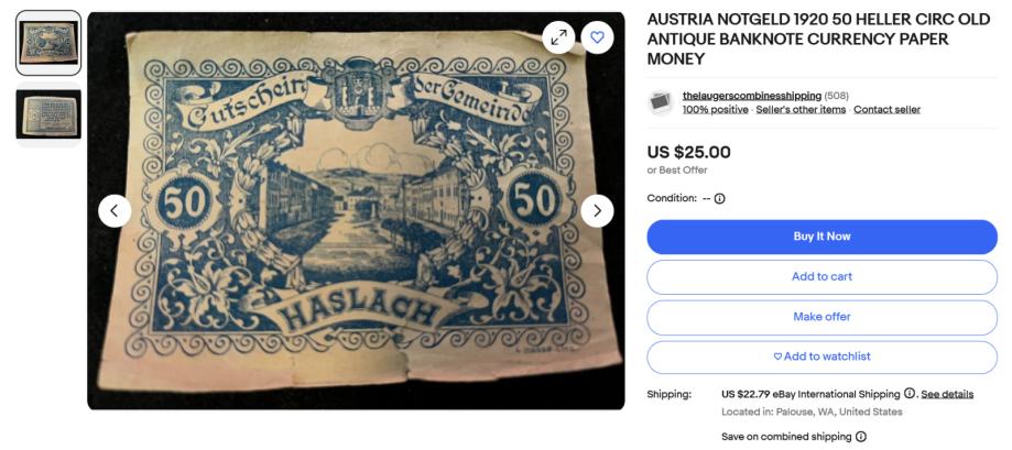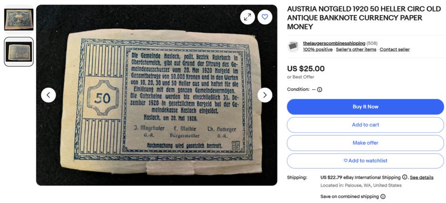 Prodam notgeld na fotografiji: Avstrija - 50 heller Haslach UNC . Pripeta eBay cena in kvaliteta.