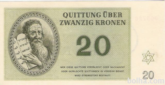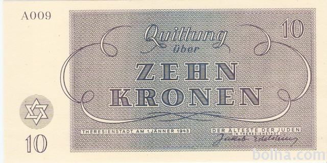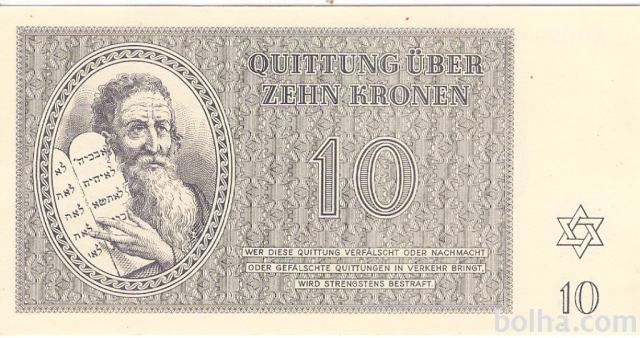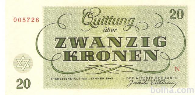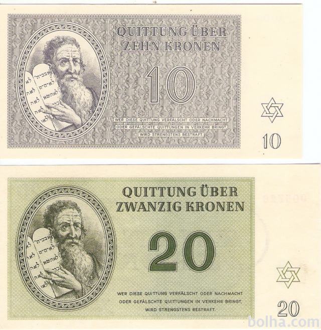 Prodam IZREDNO redek ZGODOVINSKI bankovec 10 KRONEN P-C4114 CENA € 39,90 20 KRONEN P-C4115 CENA € 44,90 (THERESIENSTADT ČEŠKA IN MORAVSKA NEMČIJA REICH)1943.UNC. NEMŠKI SS je za potrebe PROPAGANDE NACI NEMČIJE organiziral "VZORČNI PRIMER ŽIDOVSKEGA NASELJA", V ČEŠKEM MESTU TEREZIN, PO NEMŠKO THERESIENSTADT, ZA ŽIDE Z ZASLUGAMI ZA NEMČIJO IN OSTALE SVETOVNO ZNANE UMETNIKE IZ CELE OKUPIRANE EVROPE. V GETU SO IMELI "SAMOUPRAVO" POD KONTROLO NEMŠKE SS. VSAK JE DOBIL 50 KRON ZA 1 MESEC... NA BANKOVCU JE VODJA KULTURNEGA SVETA, NAJSTAREJŠI ZAPORNIK JAKOB EDELSTEIN...(.DEJANSKO PA JE BILO KONCETRACIJSKO TABORIŠČE, "PREHODNI KAMP ZA SMRT"...).