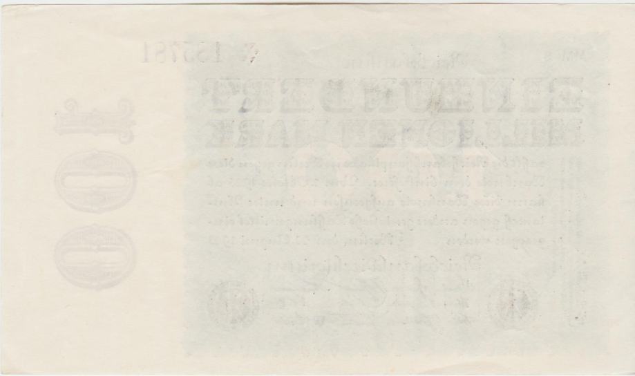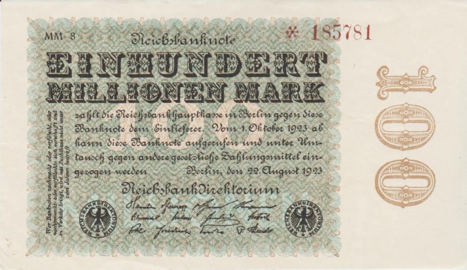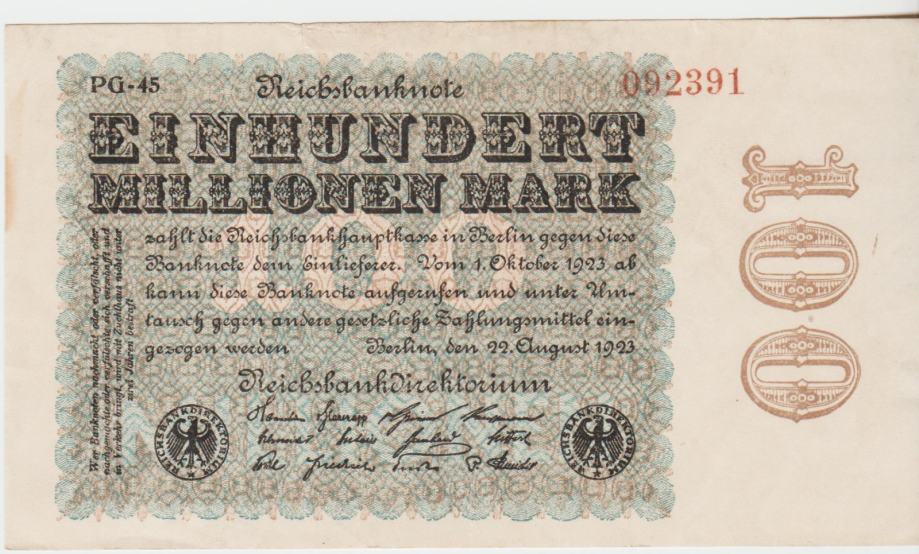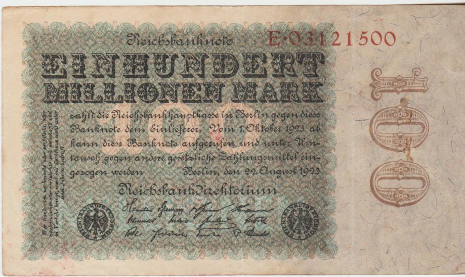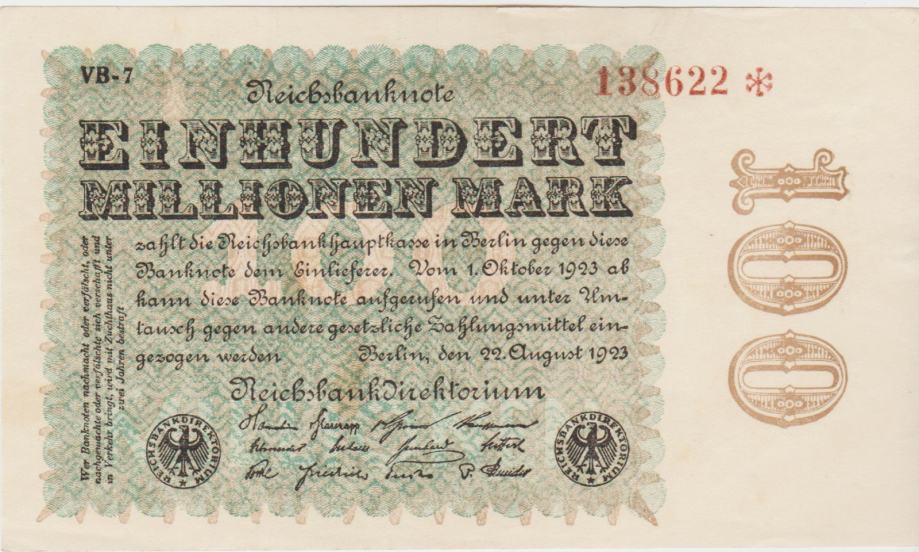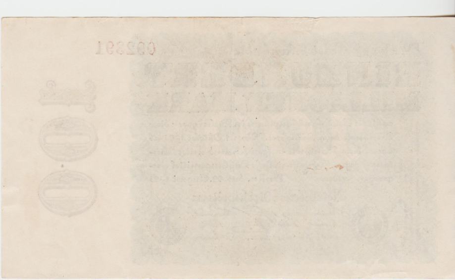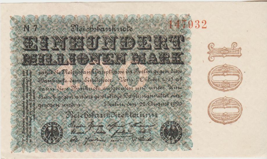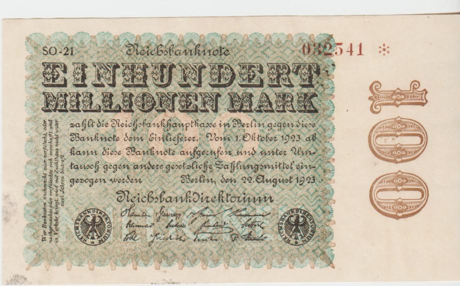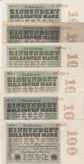 Prodam RAZLIČNE bankovce 100 MILLIONEN MARK P107-a,b,c,d,e,f, "ser.MM,E,SO,,VB,N in PG (NEMŠKI REICH NEMČIJA) 1923, XF/aUNC Kvaliteta. CENA JE ZA 1 BANKOVEC.