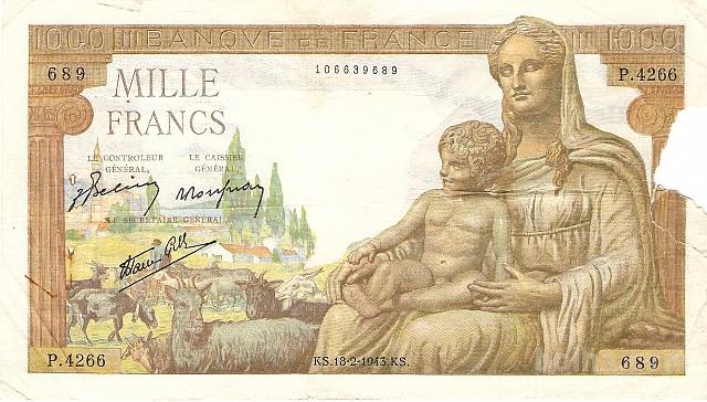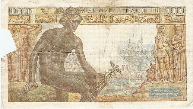PRODAM VELIK (190 X 115 mm) IN REDEK BANKOVEC 1000 FRANCS (FRANCIJA) 18.2.1943. OB STRANI RAZSTRGAN, SICER BI BIL VF/XF kvaliteta.