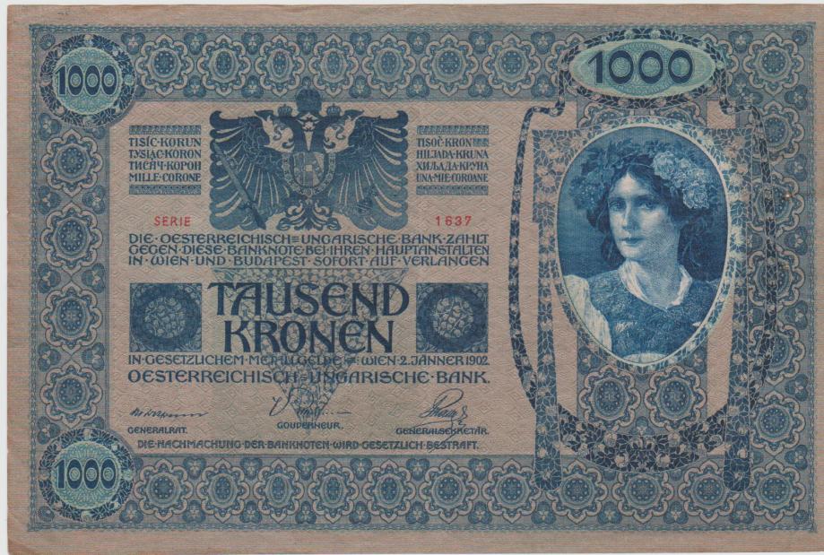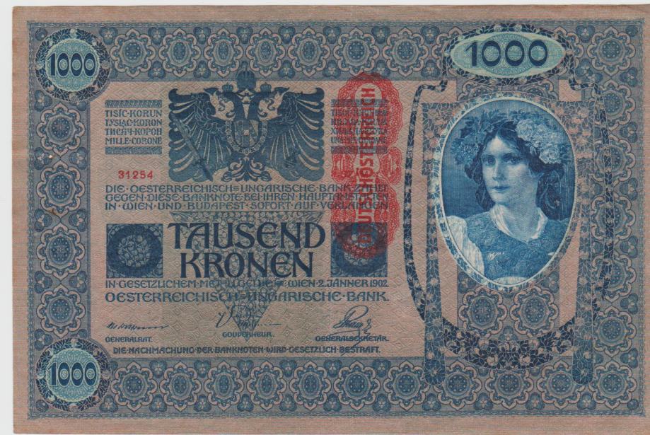 Prodam VELIK BANKOVEC 1000 KRONEN P59 ŽIG pretisk vertikalno ( AVSTRIJA AVSTROOGRSKA)1902(1919) aUNC kvaliteta.