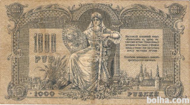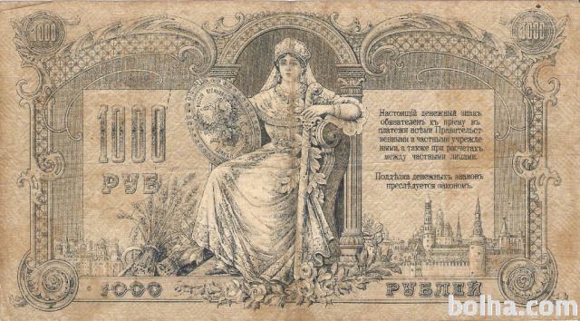 Prodam VELIK BANKOVEC 1000 RUBLEI PS418b (JUŽNA RUSIJA) 1919, DEJANSKO DENAR CARSKE RUSIJE S SVASTIKO, VF kvaliteta - CENA JE ZA 1 BANKOVEC.