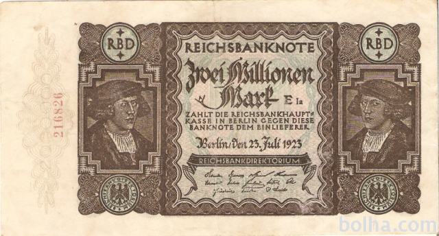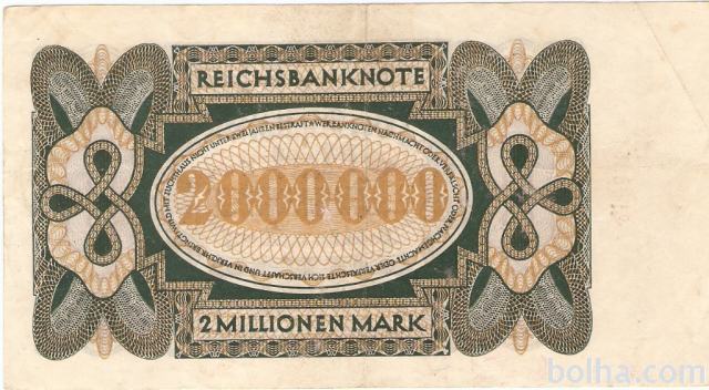 Prodam bankovec 2 MILLIONEN MARK P89a XF "216826" CENA € 7,90 (NEMŠKI REICH NEMČIJA), 1923. Kvaliteta
