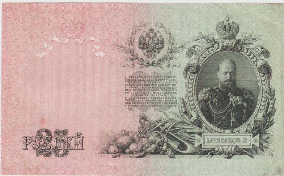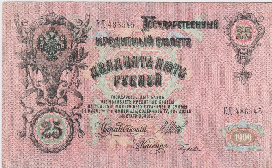 BANK. 25 RUBLEI P12b.3.4 Podpis Shipov-Gusev (CAR RUSIJA)1917(1909).XF