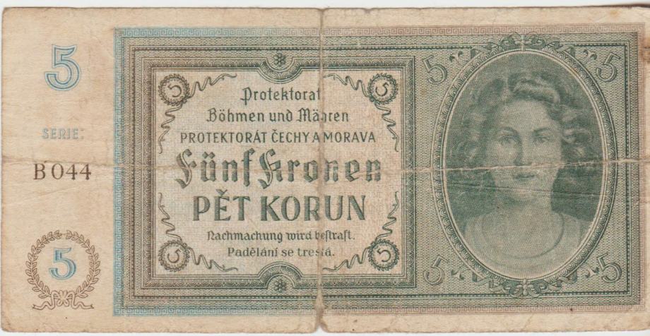 BANK. 5 KORUN P4a (BOHEMIA-MORAVIA NEM.PROT.ČEŠKA-MORAVSKA) 1940.F/VF