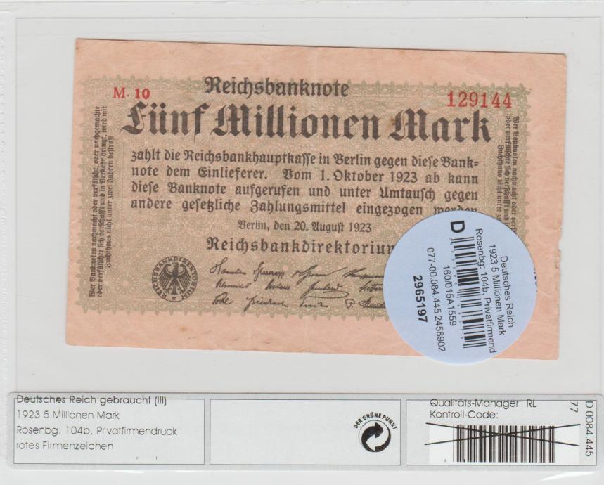 BANK. 5 MILLIONEN MARK (5000000) P104b sat (N.REICH NEMČIJA)1923,VF/XF