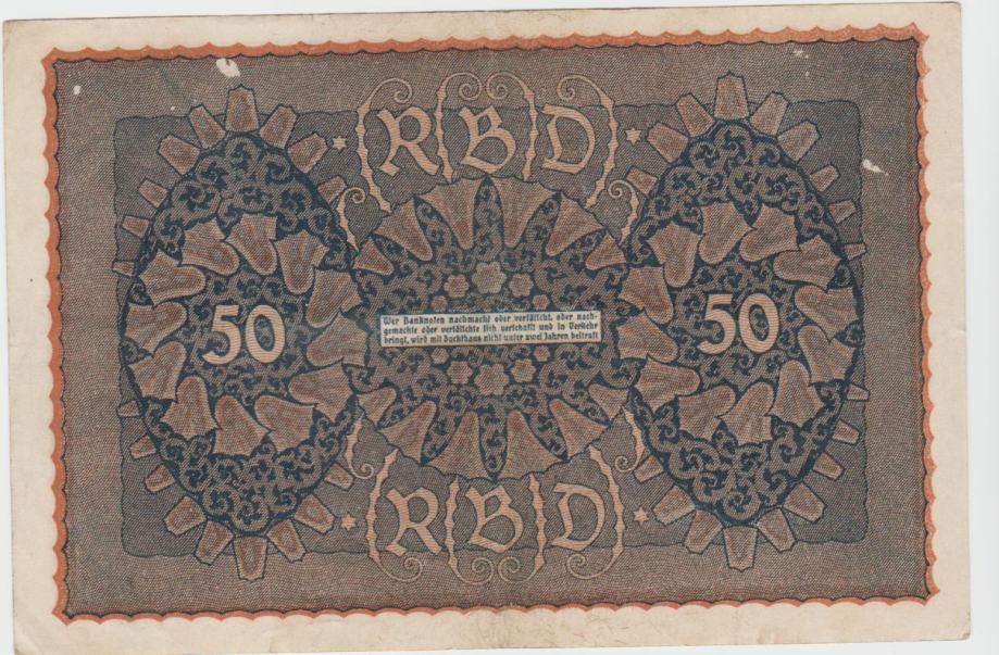 Prodam bankovec 50 MARK P66/1 "REICH1" (NEMŠKI REICH NEMČIJA) 1919 XF Kvaliteta