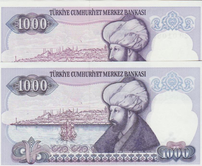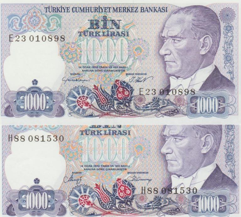Prodam bankovec ŠE 100 LIRASI P194b-1970 IN 1.000 LIRASI P196a.1-1986-serija E IN P196a.2-1988-serija J,H . (TURČIJA) UNC kvaliteta. CENA JE ZA 1 BANKOVEC."Mustafa Kemal Atatürk"