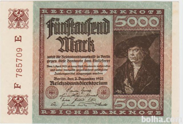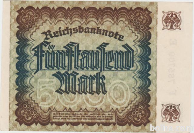 Prodam RAZLIČNA bankovca 5.000 MARK P-81b/2" VODNI TISK-OSMICE" 6 številk (NEMŠKI REICH NEMČIJA). aUNC/UNC Kvaliteta.