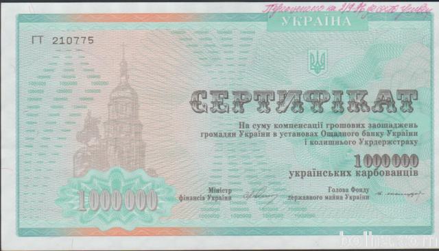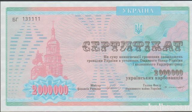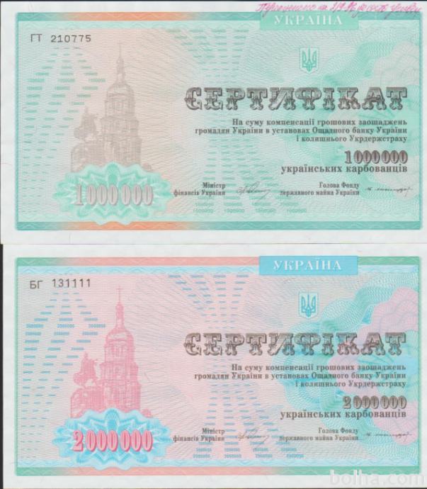 Prodam bankovec - CERTIFIKAT 1.000.000 KARBOVANEZ P-91a IN 2.000.000 KARBOVANEZ P-91b (UKRAJINA) 1992 aUNC kvaliteta, CENA JE ZA 1 BANKOVEC.