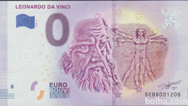 Prodam SPOMINSKI BANKOVEC SERIJA 0 EURO -LEONARDI DE VINČI-,2019-1(EVROPSKA BANKA) UNC kvalitete.-VODNI TISK, ZAŠČITNI TRAK ,vijolične barve, serijsko številko, UV črnilo, hologram, vellikost 173 x 74mm...,... . Pošljem po pošti z navadnim pismom(1,10€), ali priporočeno(2,60€). Kupec plača stroške dostave.Možnost plačila na osebni račun, ali po dogovoru. 041 754 917