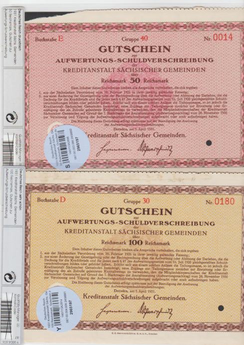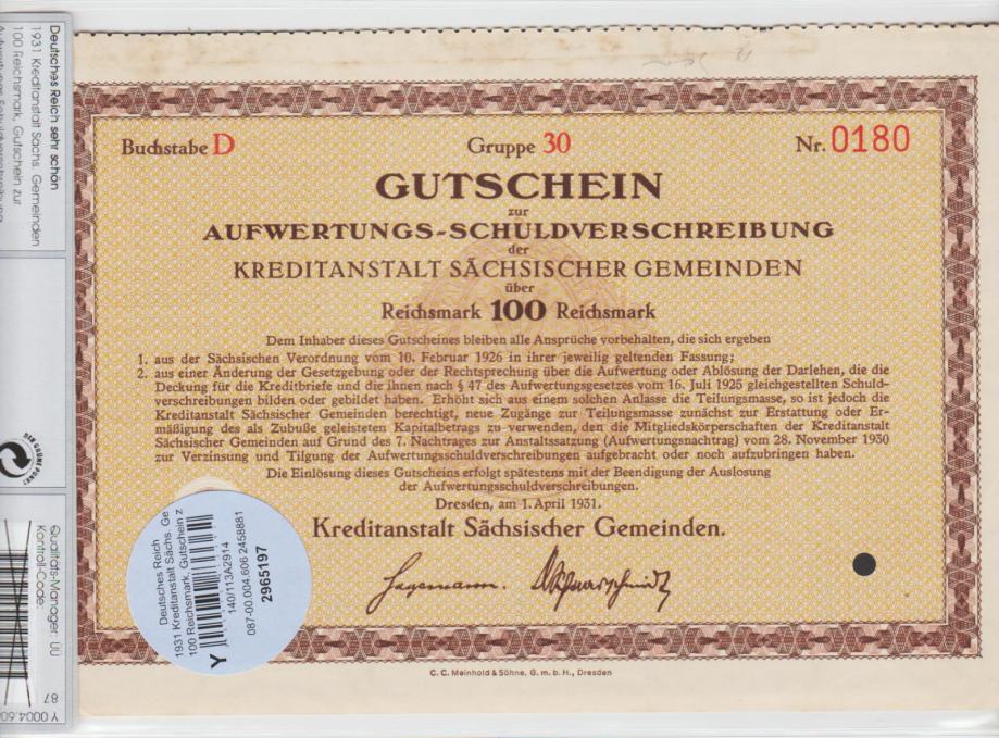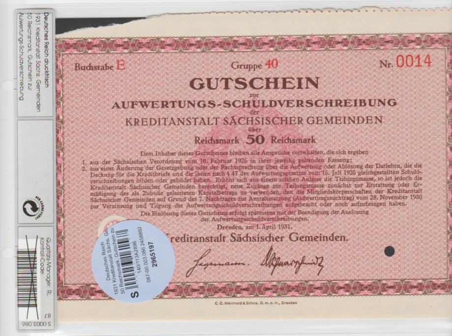 Prodam VREDNOSTNI BON 50,100 REICHMARK "1931 "Dresden-Kreditna zveza Saške -bon za prevrednoteno obveznico " v zaščitnem plaščku (NEMŠKI REICH NEMČIJA) 1931.UNC. CENA JE ZA 1 BON.