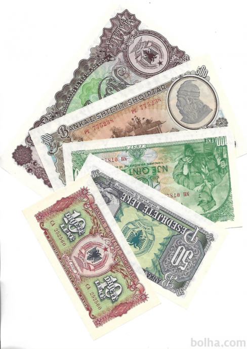 Serija nerabljenih bankovcev Albanije. Leto izdaje 1957 - nominale od 10 do 1000 Lekov