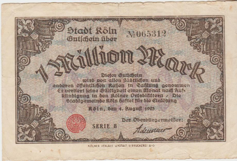 BANKOVEC 1 MILLION 1000000 MARK KOLN-B (NEM.REICH NEMČIJA)1923,VF