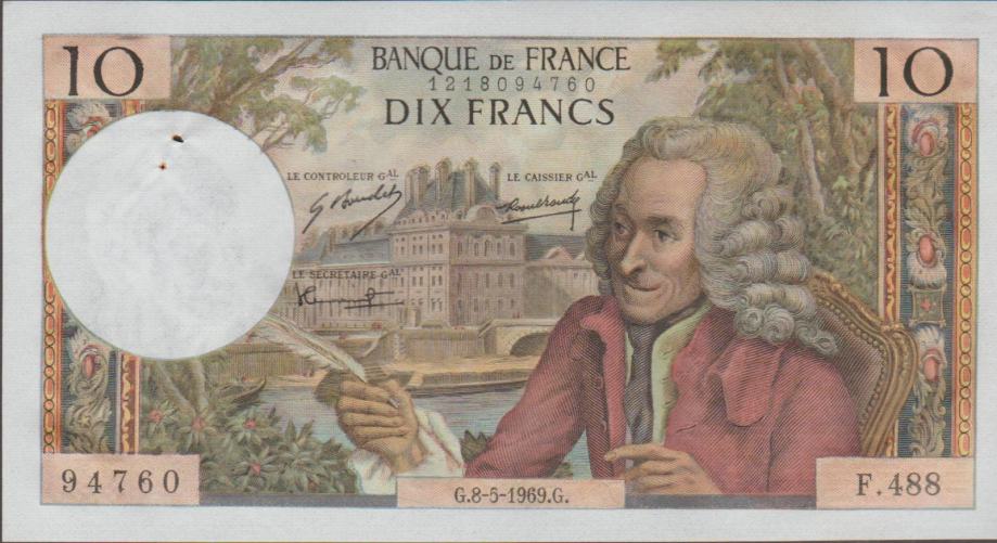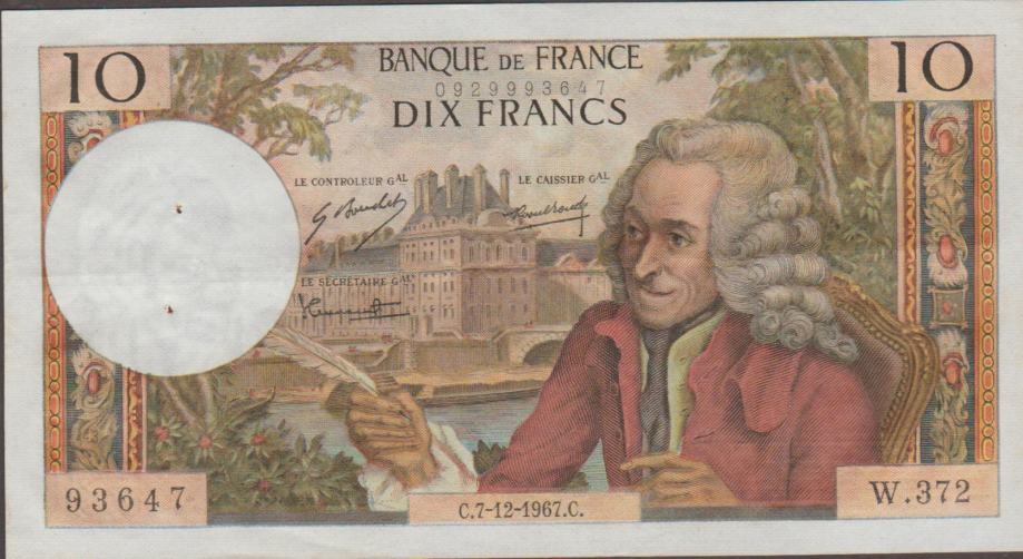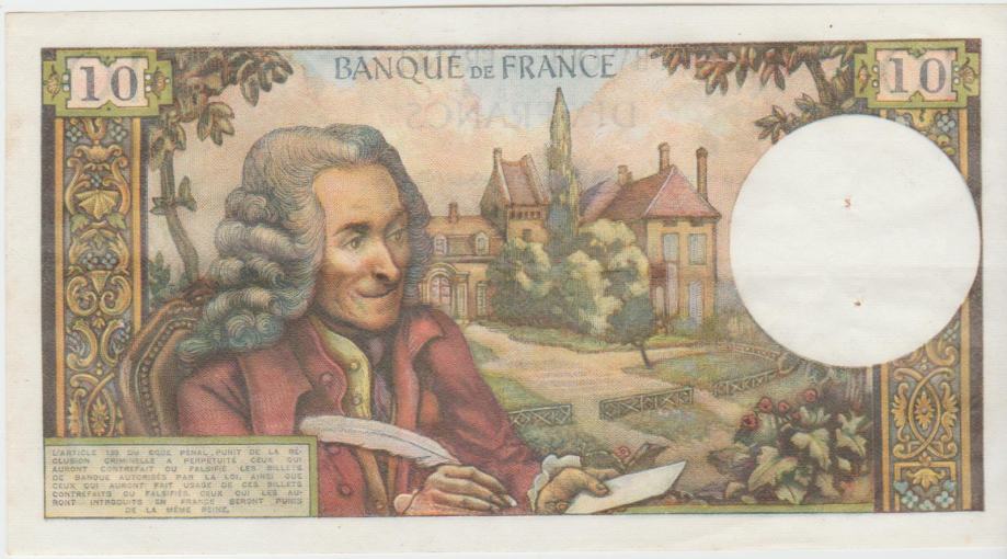 BANKOVEC 10-1967,1969 FRANCS "VOLTAIRE" (FRANCIJA) XF,XF++/aUNC,aUNC