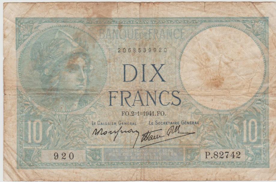 RODAM ZELO REDEK BANKOVEC 10 FRANCS P84a.26 (FRANCIJA) 2.1.1941.F/VF