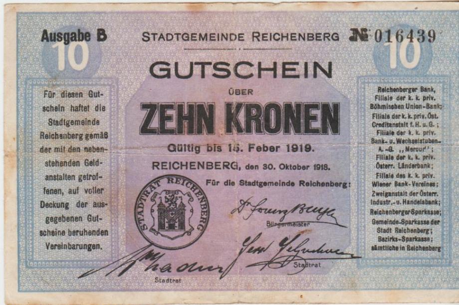 BANKOVEC 10 KRONEN (REICHENBERG AVSTROOGRSKA AVSTRIJA) 1918(1919)VF