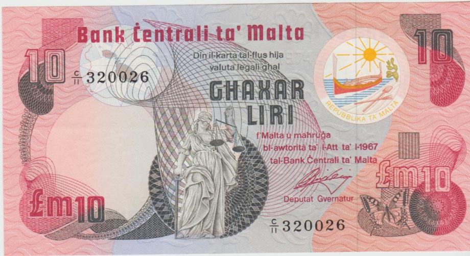 Prodam bankovec 10 LIRA (MALTA) 1979 (1967). aUNC/UNC kvaliteta.