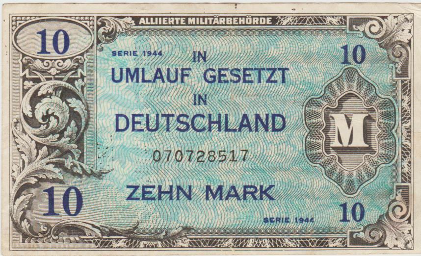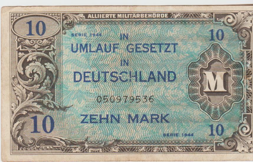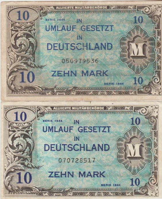 Prodam VOJAŠKI BANKOVEC 10 MARK P194b "9 ŠT."(NEMČIJA ) 1944. VF/XF Kvaliteta. - CENA JE ZA 1 BANKOVEC.