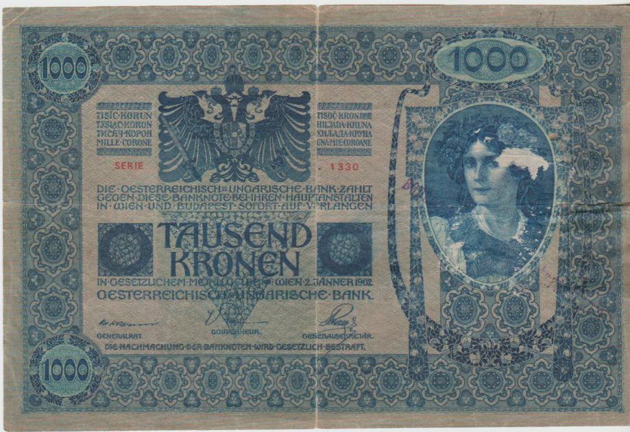 Prodam REDEK, VELIK bankovec 1000 KRONEN P8a ŽIG BJELOVAR ( AVSTRIJA AVSTROOGRSKA) 1902.VF kvaliteta.