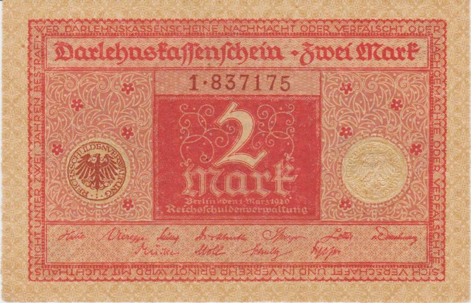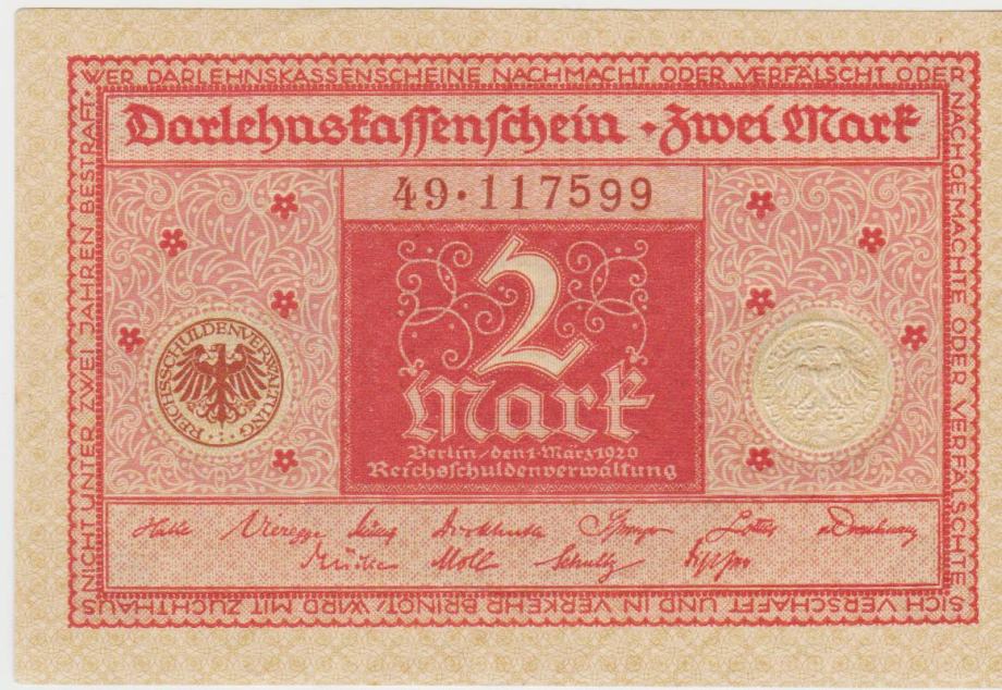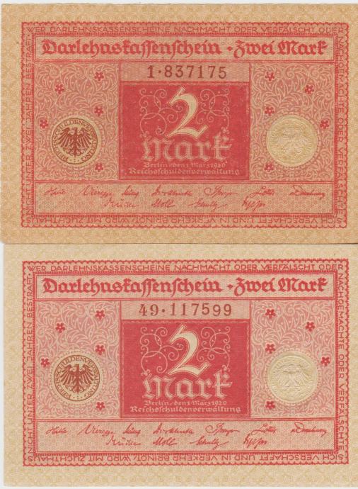 Prodam BANKOVEC 2 MARK P59a.1-ser.št.1+6 IN 2 MARK P59a.2-ser.št.2+6 (NEMŠKI REICH NEMČIJA) 1920.UNC - Kvaliteta. CENA JE ZA 1 BANKOVEC.