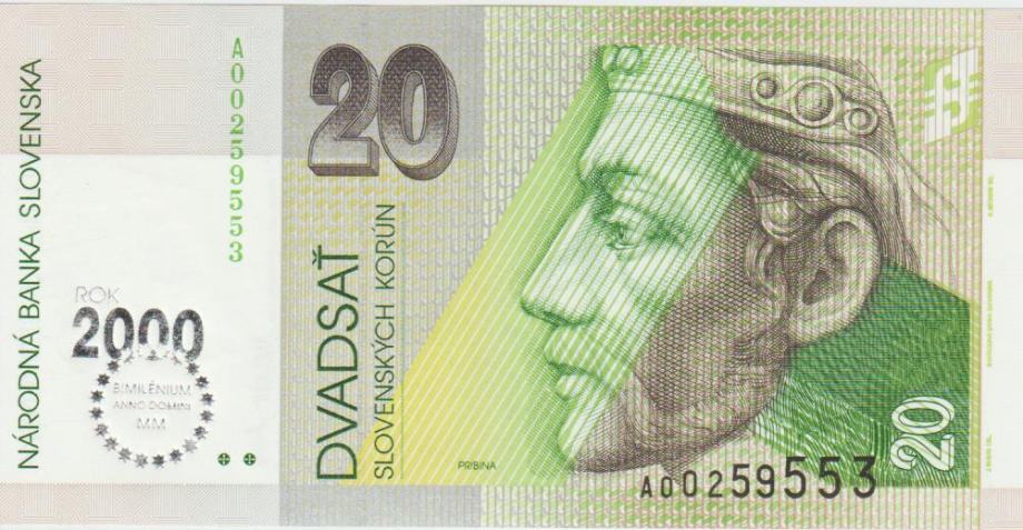 Prodam redkejši bankovec še PRILOŽNOSTNI 20 KORUN P34-2000(1993) CENA € 8.90 (SLOVAŠKA) UNC kvalitete.