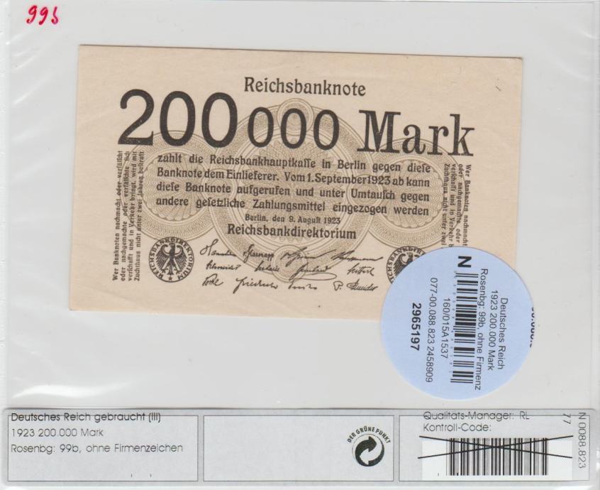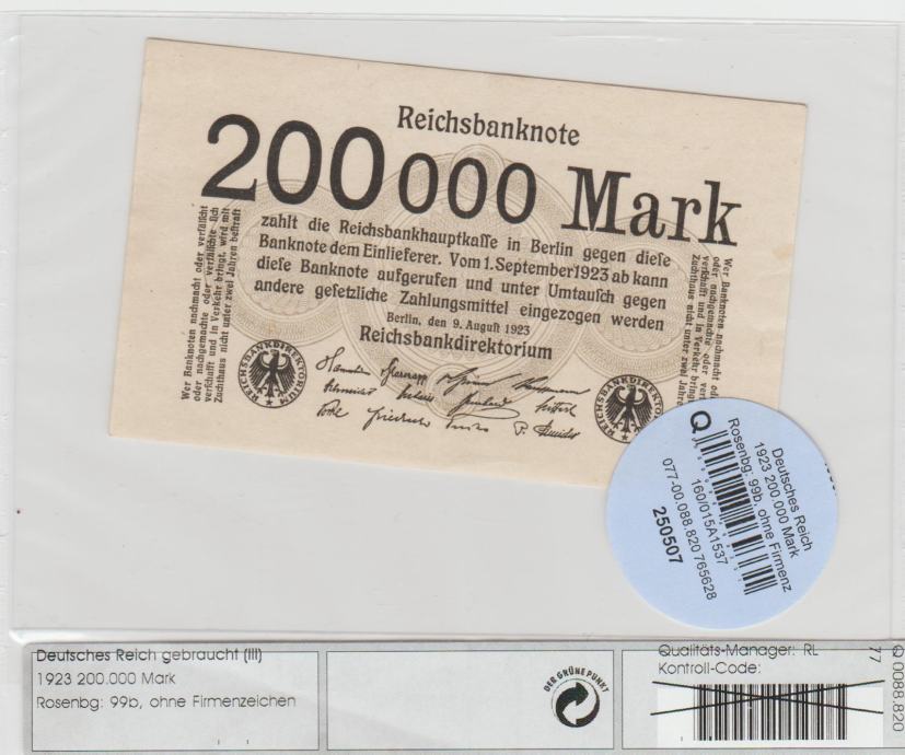 BANKOVEC 200000 MARK P100 -V PLAŠČKU (NEM. RAICH NEMČIJA)1923.aUNC/UNC