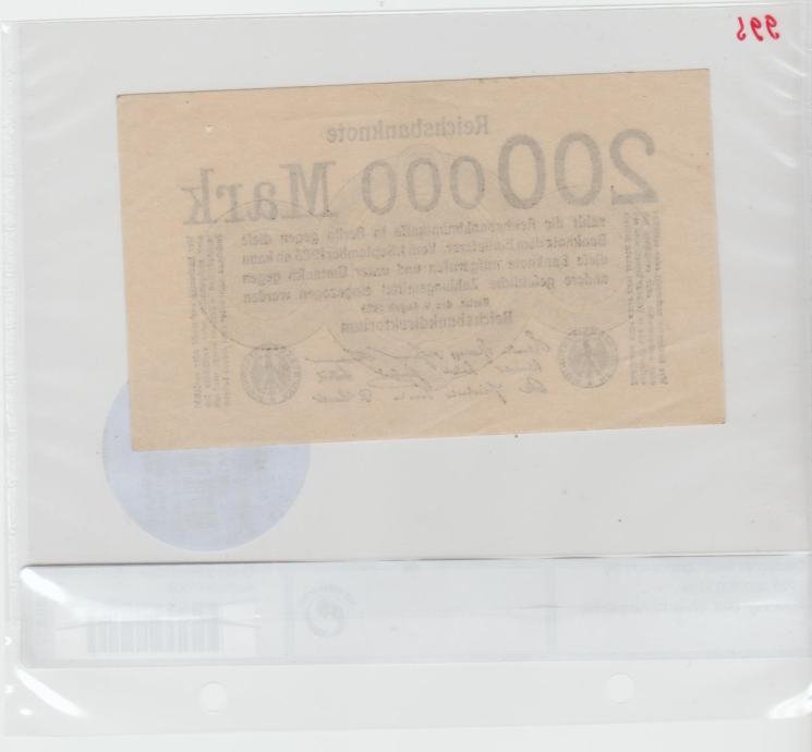 Prodam bankovec 200.000 MARK P100 "V ZAŠČ.PLAŠČKU" (NEMŠKI RAICH NEMČIJA) 1923.aUNC/UNC.