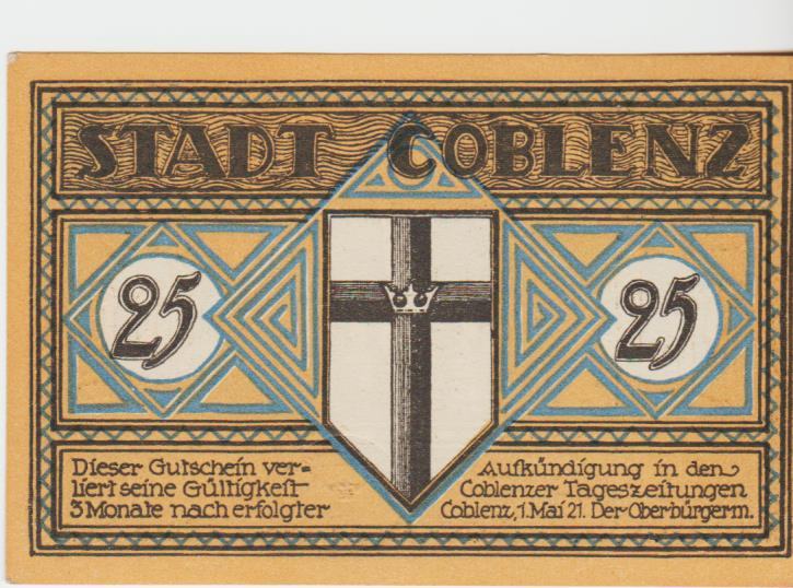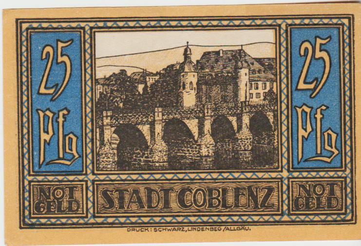 Prodam redek LOKALNI bankovec 25 PFENNIG NOTGELD (COLBLENZ NEMČIJA NEMŠKI REICH) 1921,UNC Kvaliteta. Izdan po koncu 1. svetovne vojne, po razpadu Nemško - Avstroogrske monarhije..