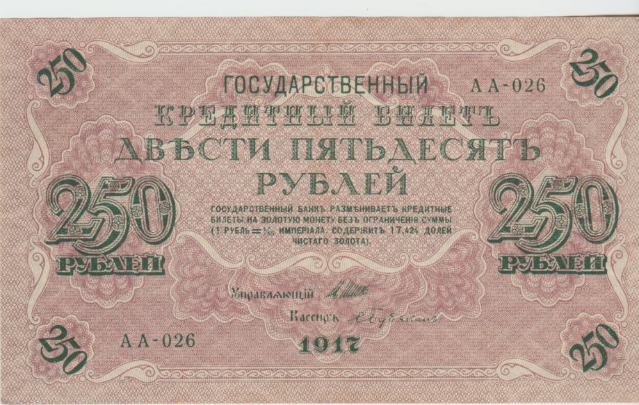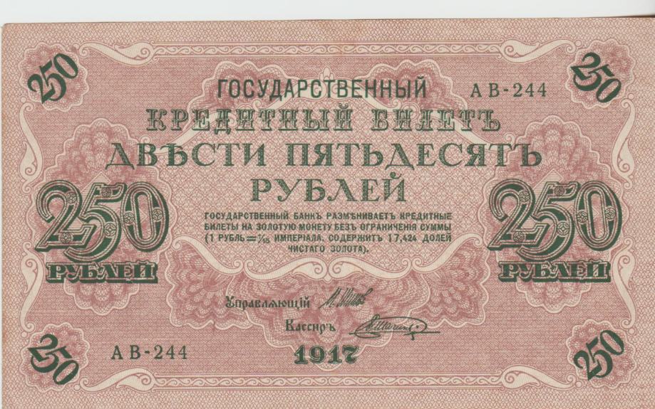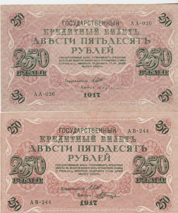 Prodam VEČJI, REDEK BANKOVEC (175 x 105 mm) 250 RUBLEI P36.2.4 "sig.Ivan Shipov = Bubyakin"-ZGORNJI IN 250 RUBLEI P36.2.13 "sig. Ivan Shipov = Shagin"-SPODNJI (CARSKA RUSIJA) 1917,XF/XF+ kvaliteta . CENA JE ZA 1 BANKOVEC.